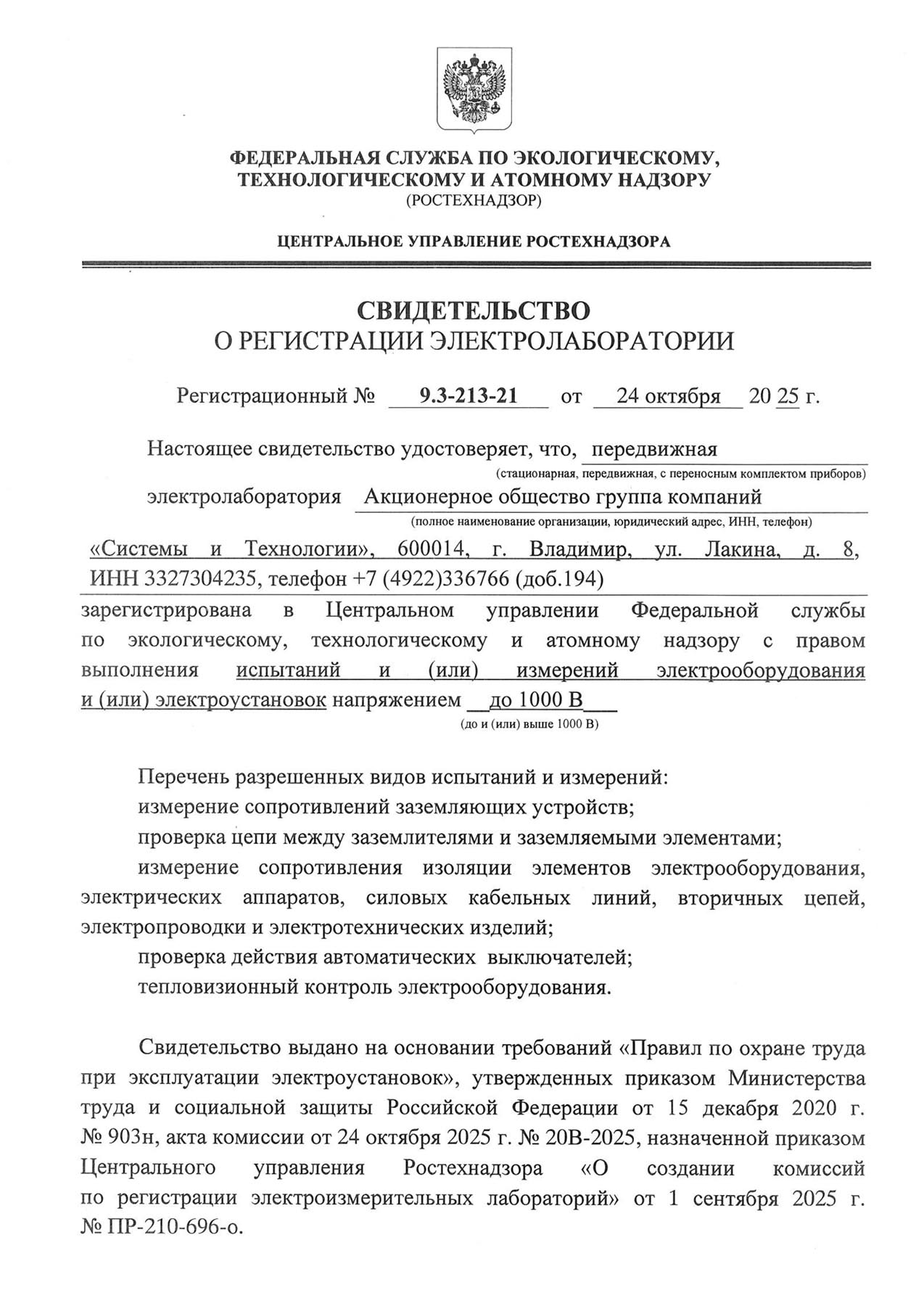 Свидетельство о регистрации электротехнической лаборатории